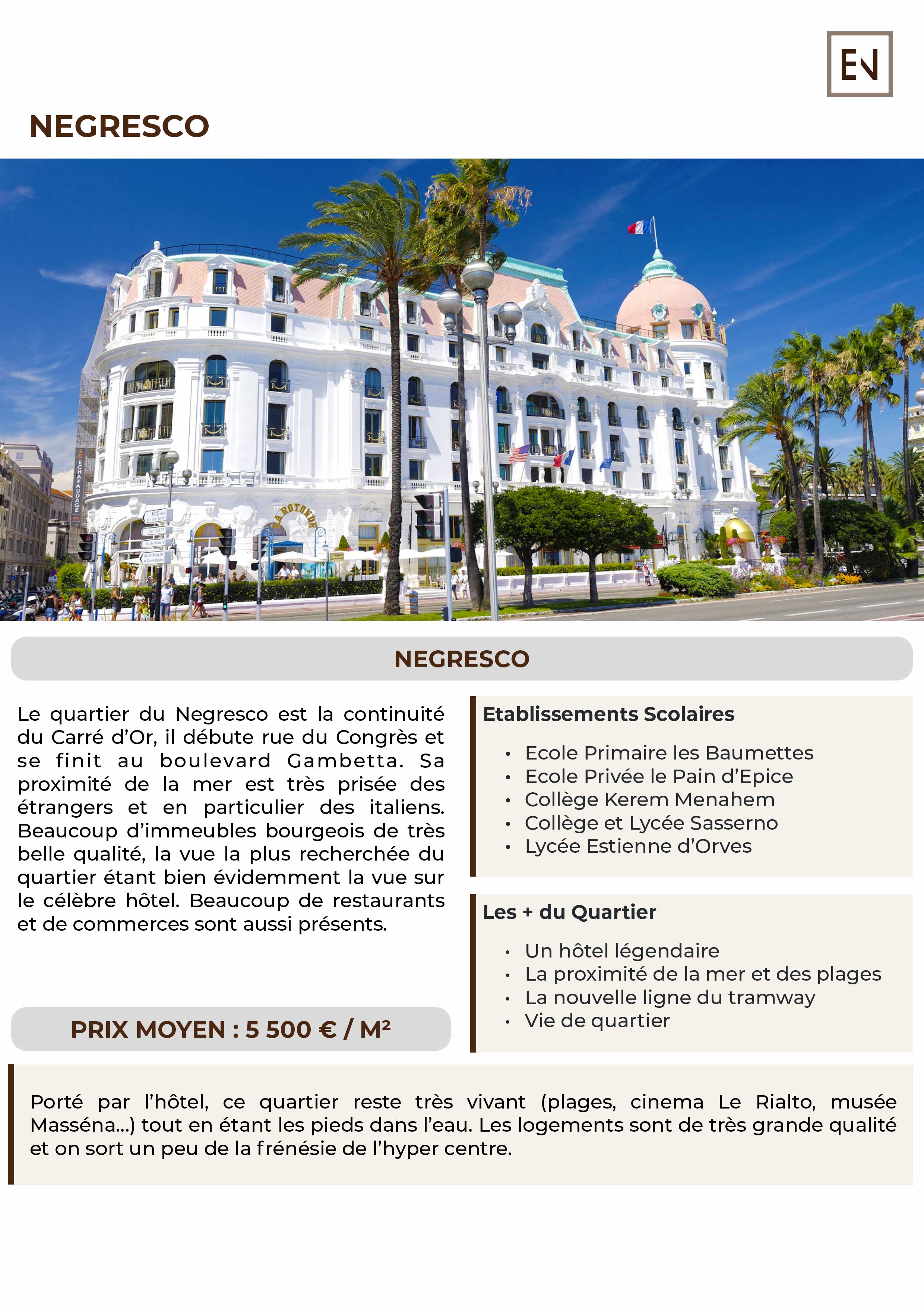 Porté par l’hôtel, ce quartier reste très vivant (plages, cinema Le Rialto, musée Masséna…) tout en étant les pieds dans l’eau. Les logements sont de très grande qualité et on sort un peu de la frénésie de l’hyper centre.