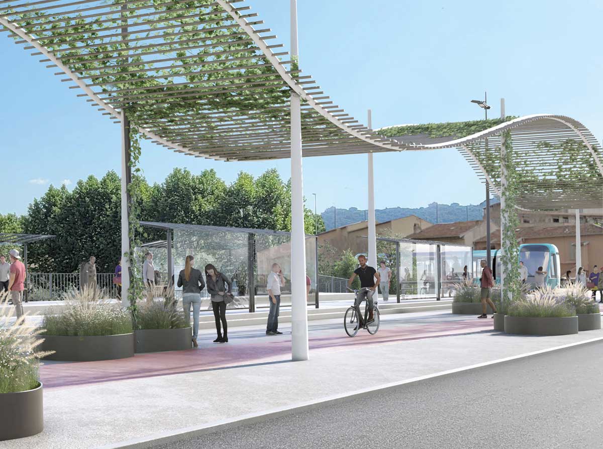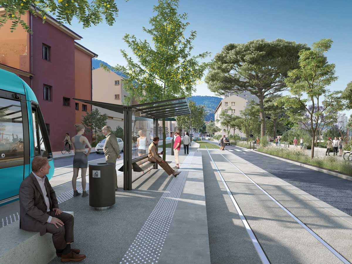 Les visuels présentés sont des intentions d’aménagement du projet de la ligne 5 de tramway. Les documents présentés ne sont pas figés pour les études futures et sont susceptibles d’évoluer.