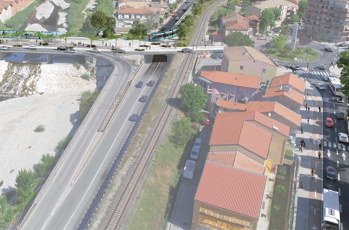 Les objectifs de la ligne 5 de tramway s’articulent autour de 3 axes : environnementaux, climatiques et économiques. Le but étant de requalifier les espaces publics en proposant un mode de transport doux et moins polluant. L’arrivée de ce nouveau mode de transport est une véritable opportunité pour changer profondément la physionomie de la vallée du Paillon.